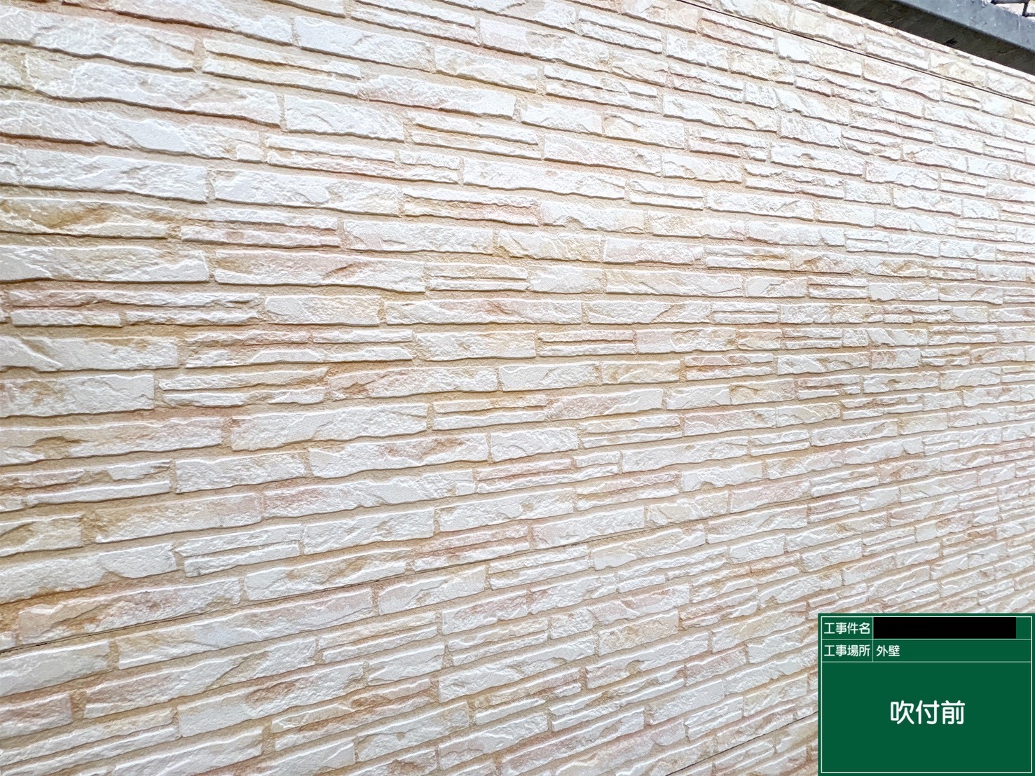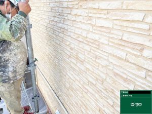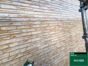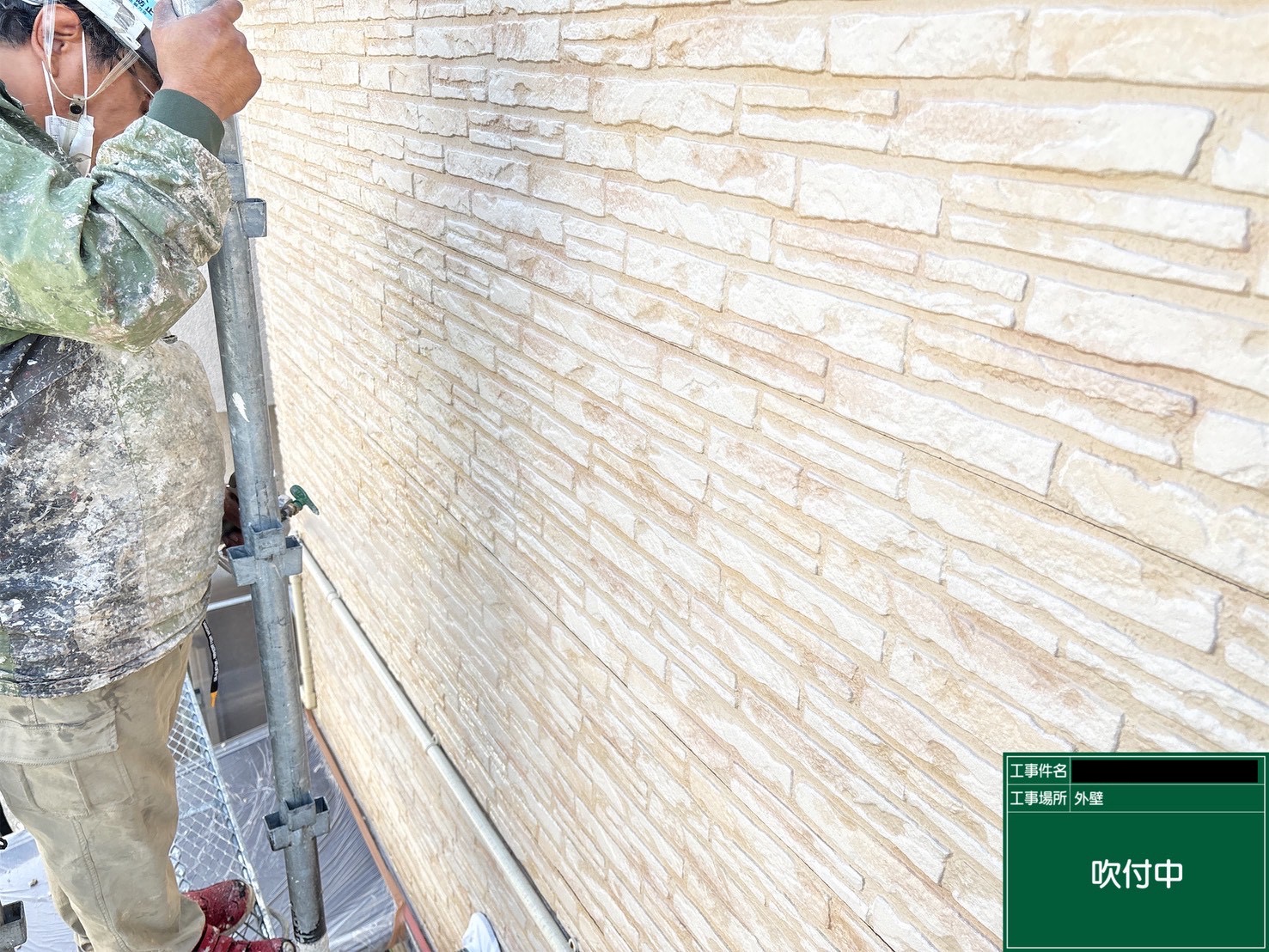 まずは高圧洗浄で外壁の汚れをキレイに落とし、乾燥後吹き付け一回目を行います。