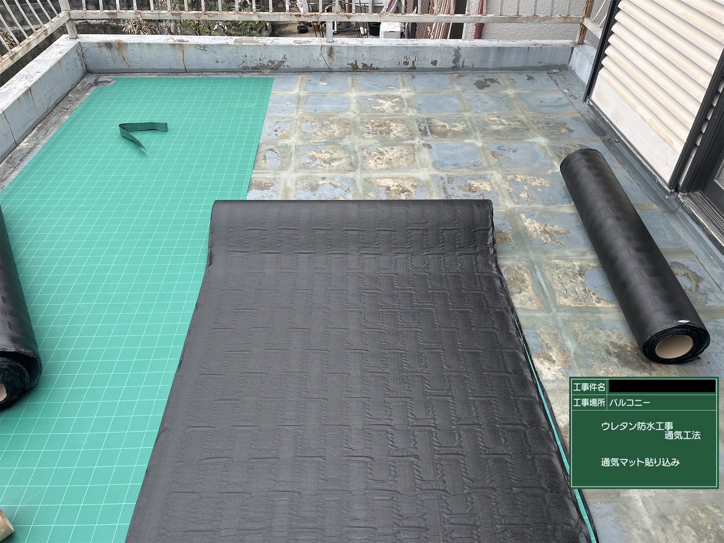 下地と防水層の間に通気マットを張り込み、下地に含まれる水蒸気が動ける通気層を形成します。