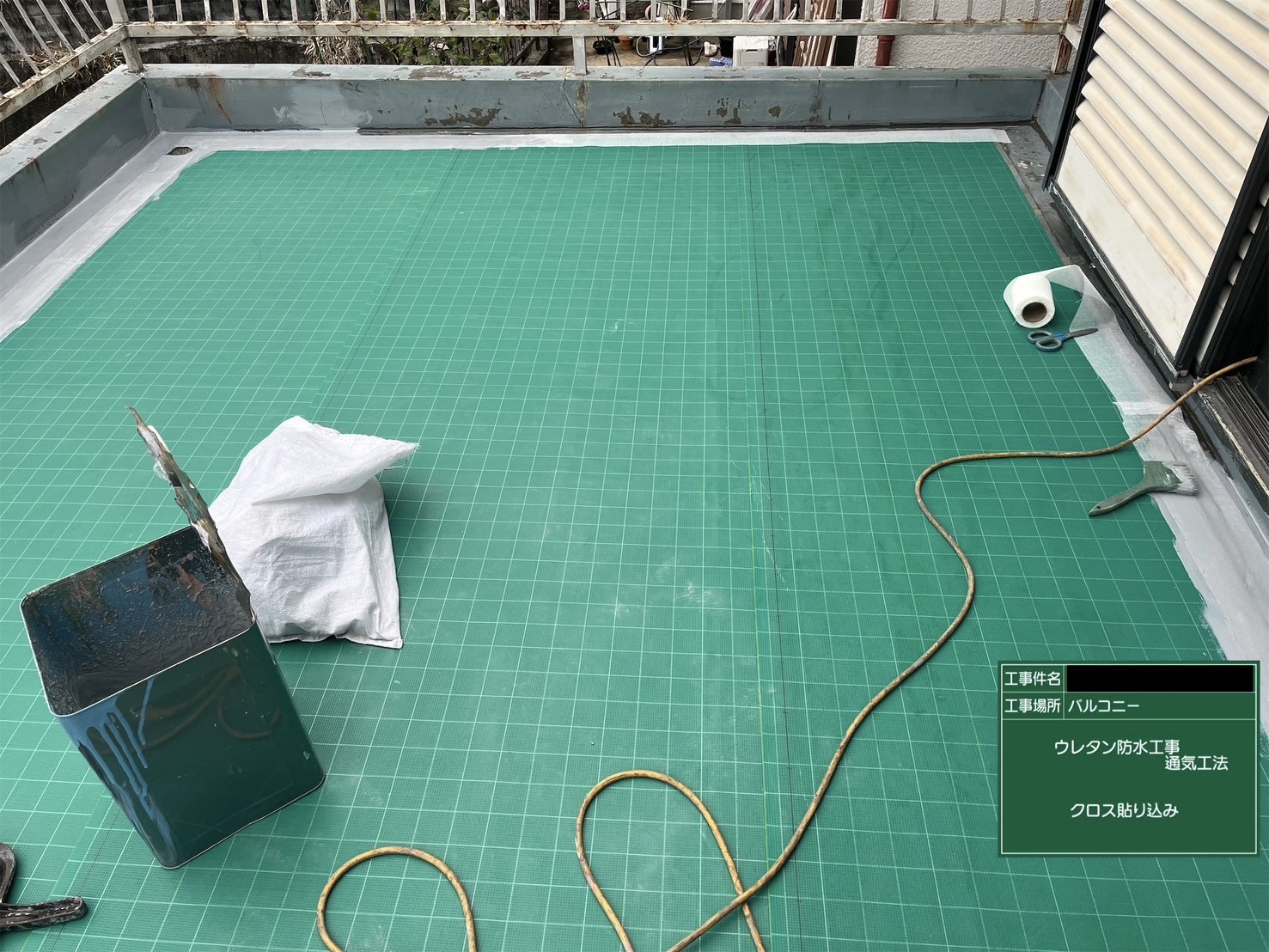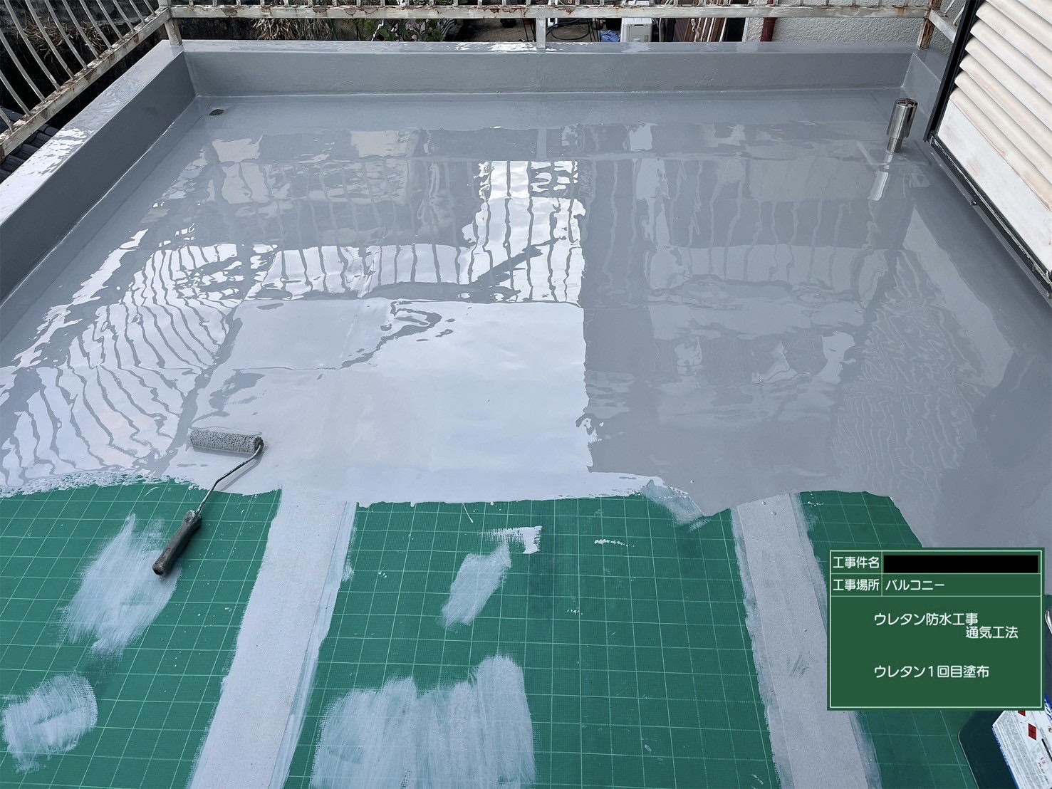 通気マットの上からウレタン防水材を2層に分けて塗布し、所定の膜厚を確保することで防水性と耐久性を確立します。