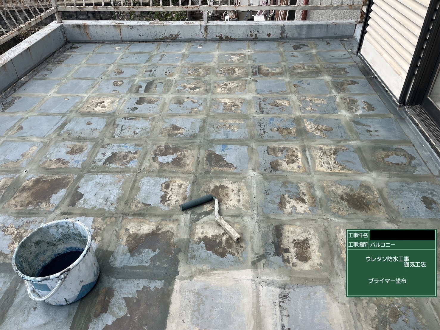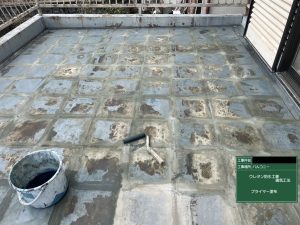 下地と防水材の密着性を高めるため、専用プライマーを均一に塗布して接着力を向上させます。
