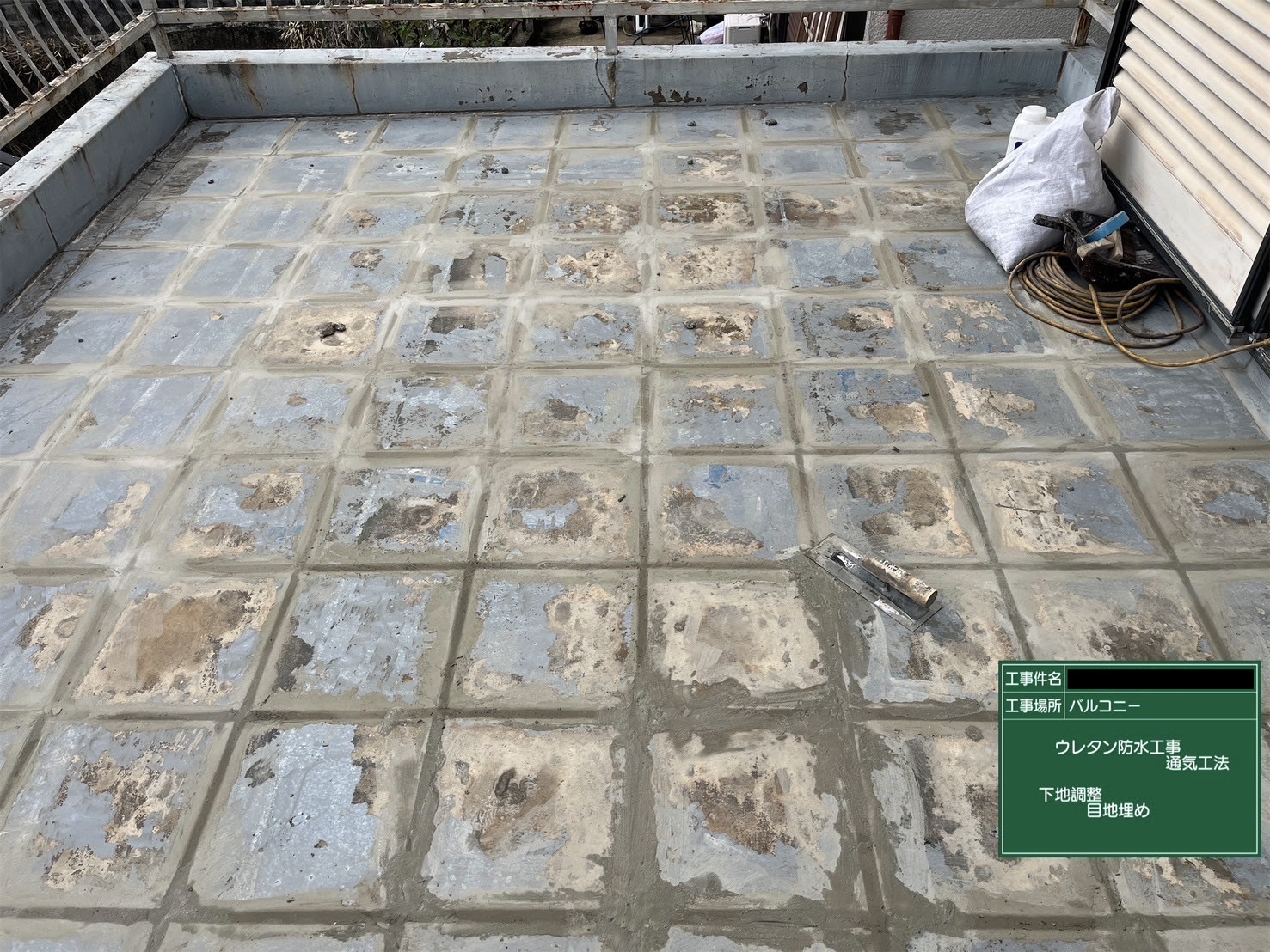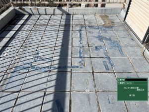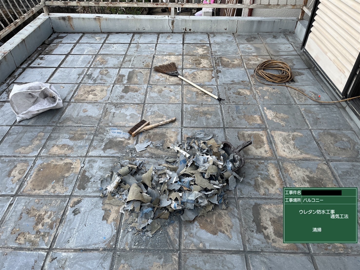 既存防水層や下地の浮き・汚れを除去し、新しい防水材がしっかり密着するように下地を整えます。