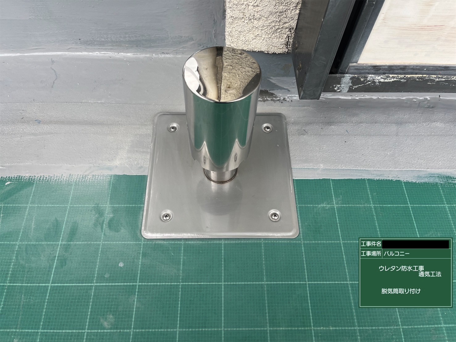 通気マット内の水蒸気を外部へ逃がすため、所定の位置に脱気筒を取り付けて膨れを防止します。
